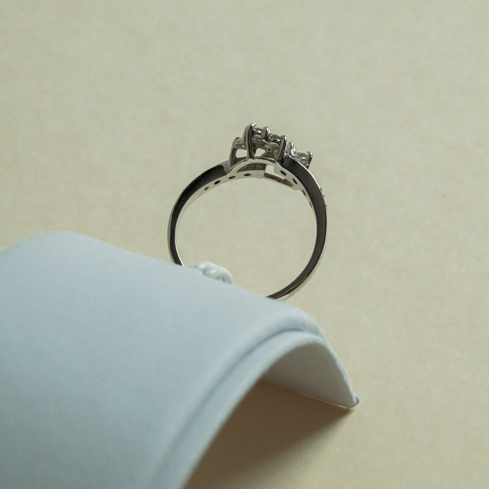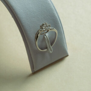 Épuré géométrique et éclat précieux se rencontrent dans cette bague sculpturale en or blanc 18 carats. Deux losanges s’entrelacent avec audace, formant une silhouette contemporaine et raffinée, symbole d’équilibre et de dualité.
