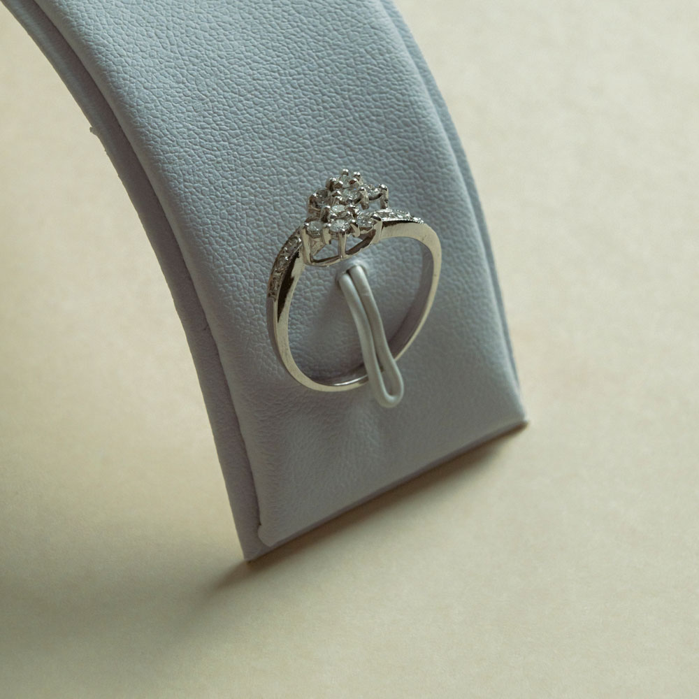 L’or blanc, choisi pour sa pureté et son éclat froid, sublime la modernité du design tout en mettant en valeur la finesse des sertissages. Conçue en taille 54, cette bague épouse la main avec élégance et caractère.