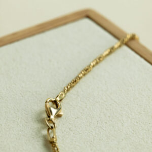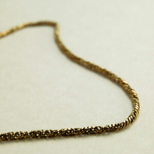 Cette chaîne ancienne en maille torsadée incarne le charme des bijoux d’antan, où chaque détail raconte une histoire. Façonnée en or jaune 18 carats, elle dévoile une torsade délicate, comme une danse de lumière figée dans le métal précieux. Sa texture subtile capte les reflets et évoque les gestes du joaillier, transmis de génération en génération. Finition artisanale et vintage.