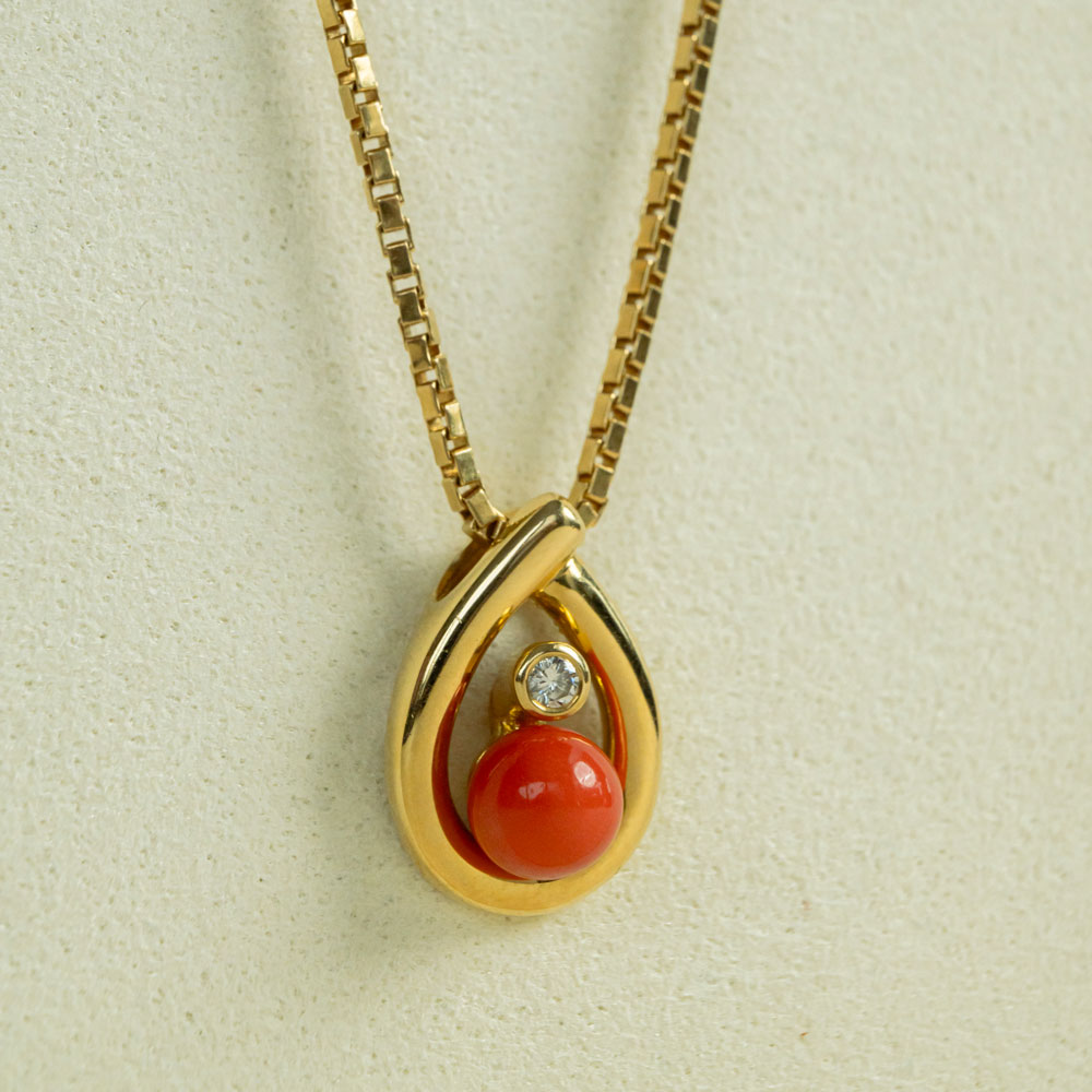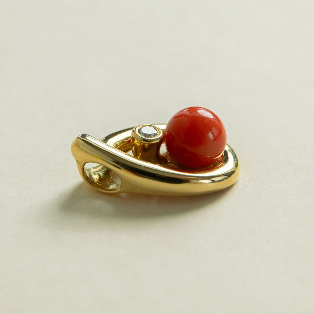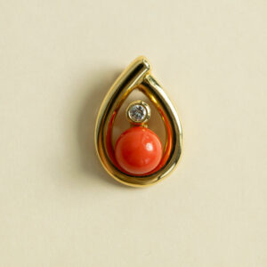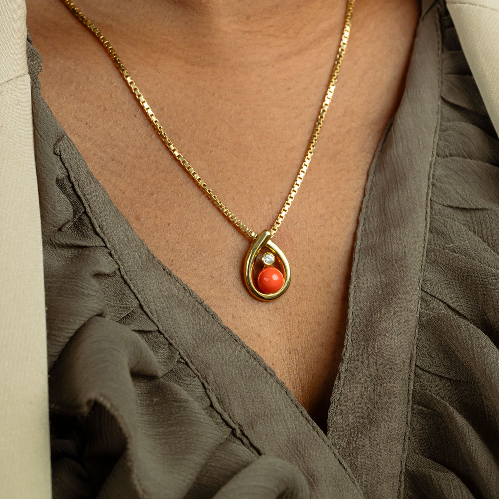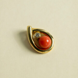 Ce pendentif ovale en or jaune 18 carats célèbre l’harmonie entre noblesse et nature. En son cœur, un corail vibrant, aux teintes chaudes et profondes, évoque les mystères marins et la force vitale. Sertie avec délicatesse, la pierre semble danser dans son écrin doré, comme un soleil couchant sur les flots.
